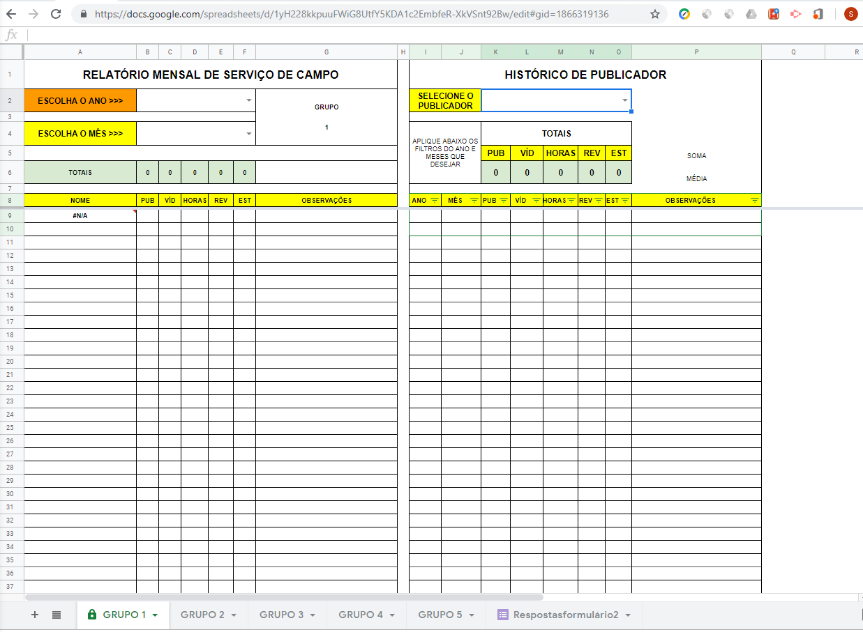 As informações chegam numa página da planilha, que serve como banco de dados. Há uma página da planilha para cada superintendente de grupo de serviço de campo consultar o histórico do seu grupo, inclusive por publicador individual.